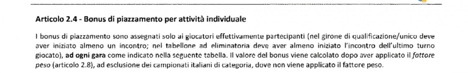 Caro @emilio68it , ora però la cosa si complica: perché è vero che dalla dicitura "bonus piazzamenti" sono state tolte le parole "tornei nazionali e campionati italiani" ma questi bonus sono calcolati in funzione del fattore peso, il quale vige solo per i tornei nazionali (2.8).