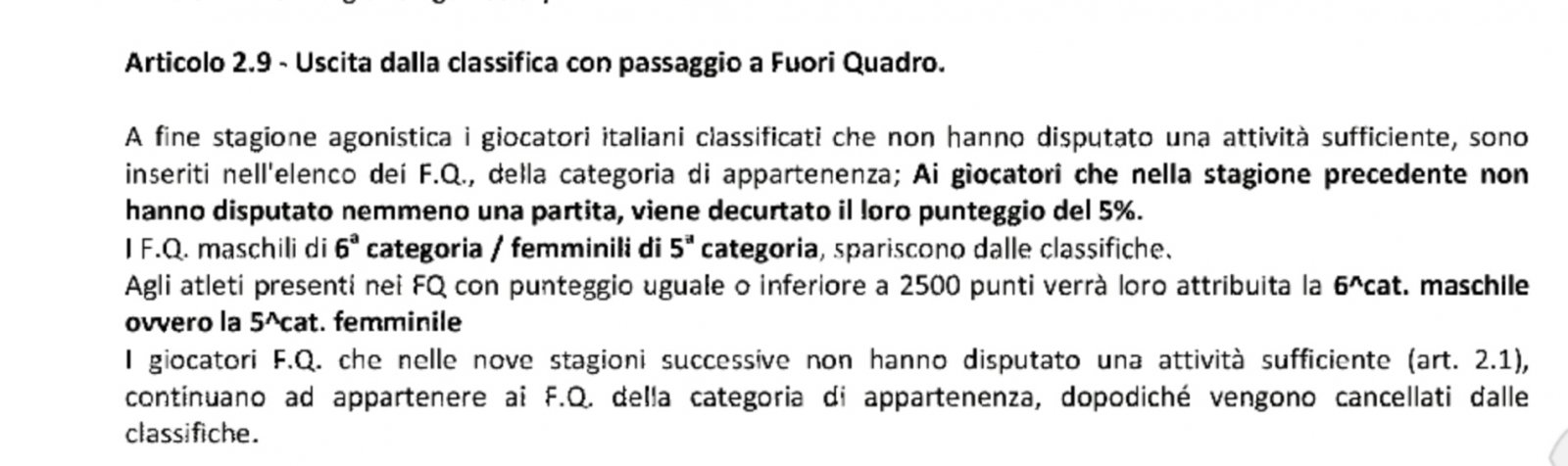 Non è come dici tu. Il caso Tatulli è diverso e non si risolve neanche con questa modifica. In particolare, il giocatore è effettivamente rimasto seconda categoria fuori quadro per qualche anno, però è rientrato, ha fatto qualche partita in d2 in modo da rientrare in classifica così da essere quarta categoria l'anno dopo (avendo perso tanti punti negli anni da fuori quadro).
