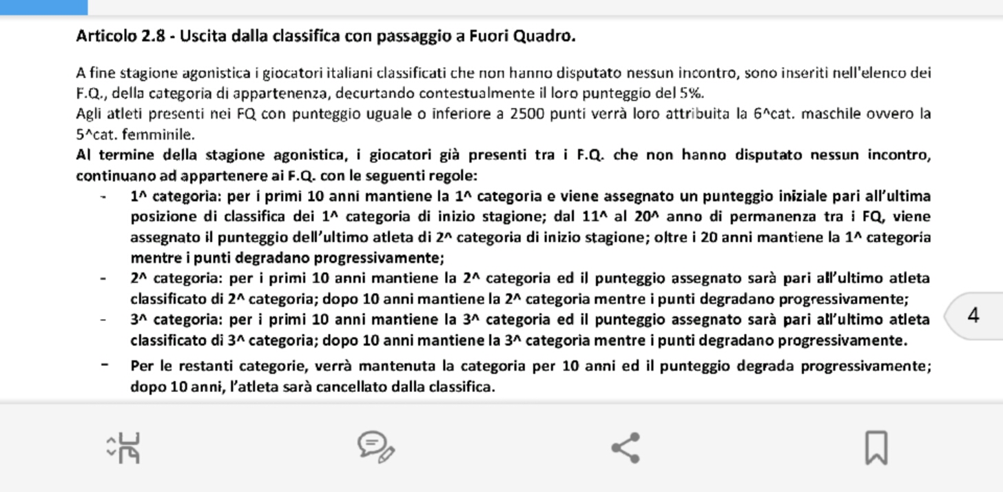 Beh a me non sembrano modifiche così insensate: se un ex quarta ricomincia a giocare l'anno prossimo rientra come quarta categoria, ma con i punti dell'ultimo quinta. Ratio della norma: evitare che un ex quarta categoria rientri come quinta o sesta e possa andare ai tornei nazionali come sesta, mentre per gli open può partecipare alle gare della sua nuova categoria, così potrá guadagnare punti e ritornare al suo effettivo livello (sempre che ci riesca).